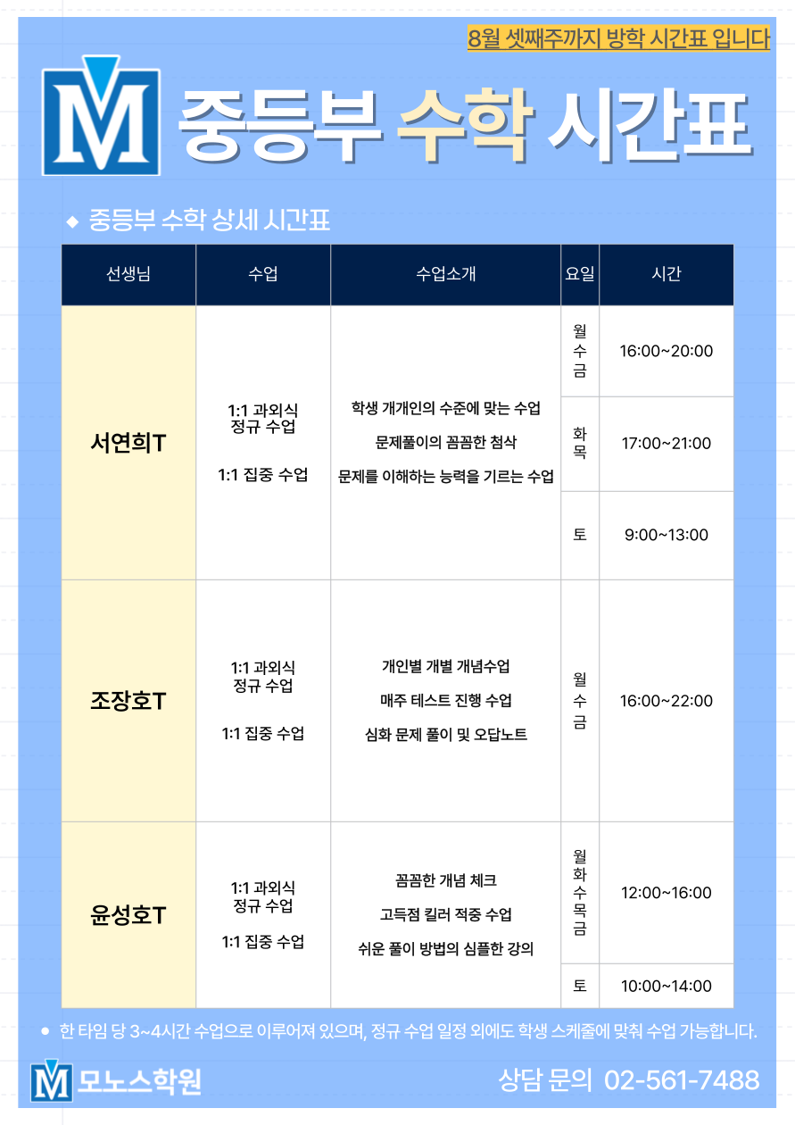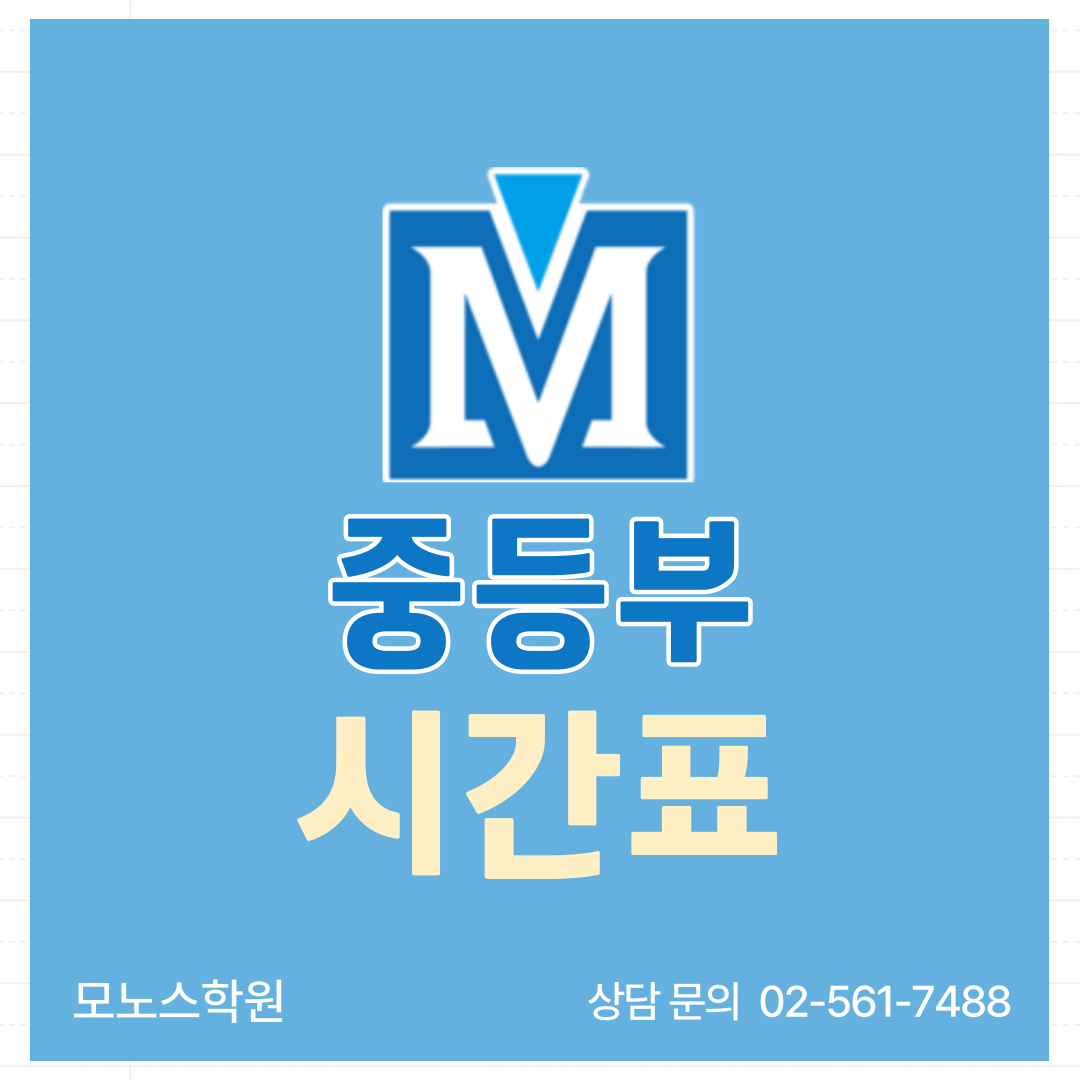 [대치동 모노스학원] 2025 여름방학 중등부 시간표